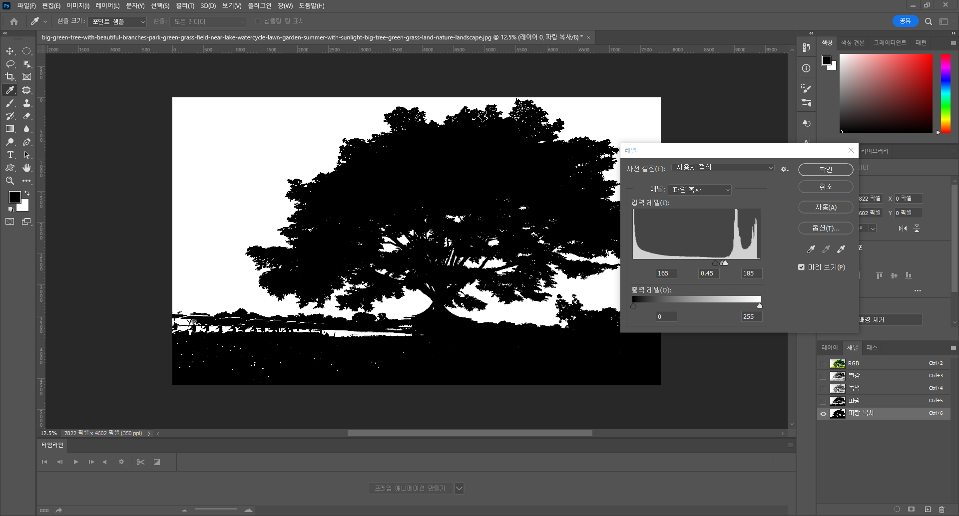 레벨값 조정 다 했으면 ctrl 버튼 누른 상태로 파랑 복사 채널을 클릭해서 선택영역을 잡아주면 된다.