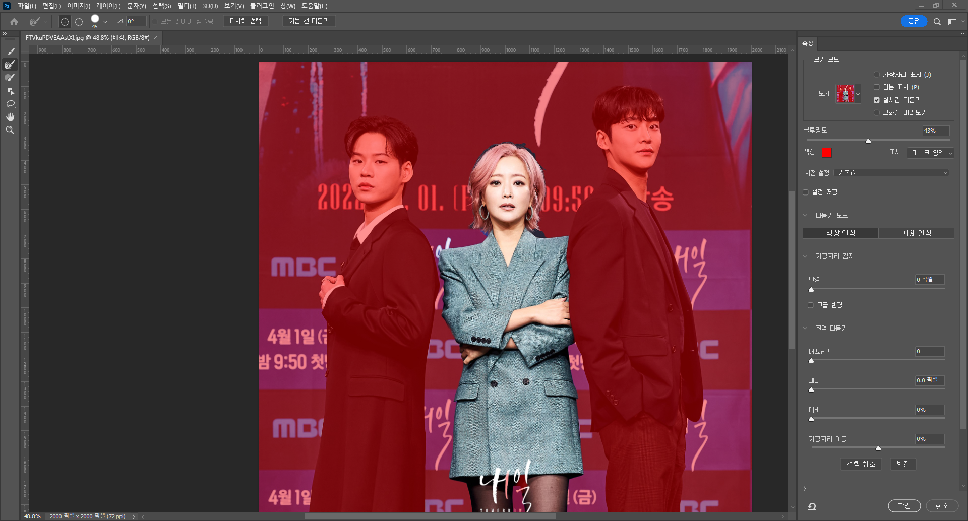 요렇게 되는데 왼쪽 툴바에서 두번째, 가장자리 다듬기 도구(리파인엣지)를 클릭!